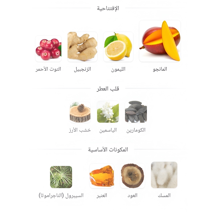 الرائحة: يجمع بين انتعاش الفواكه الاستوائية (المانجو) وحرارة التوابل والأخشاب الشرقية، مما يمنح إحساساً بالدفء والجرأة.