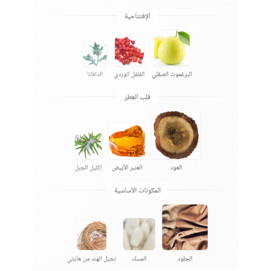 قلب العطر: العنبر الأبيض، العود، إكليل الجبل (روزماري) الأفريقي.