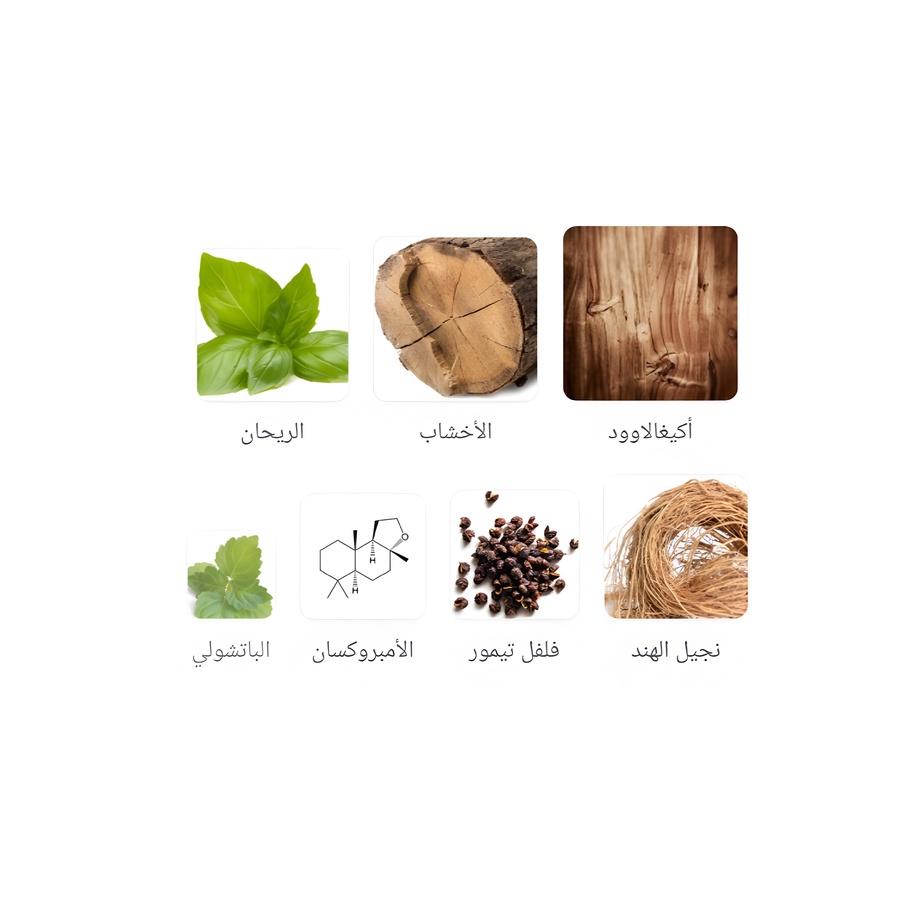 قاعدة العطر: نجيل الهند (Vetiver) والأمبروكسان لإعطاء عمق وثبات استثنائي.