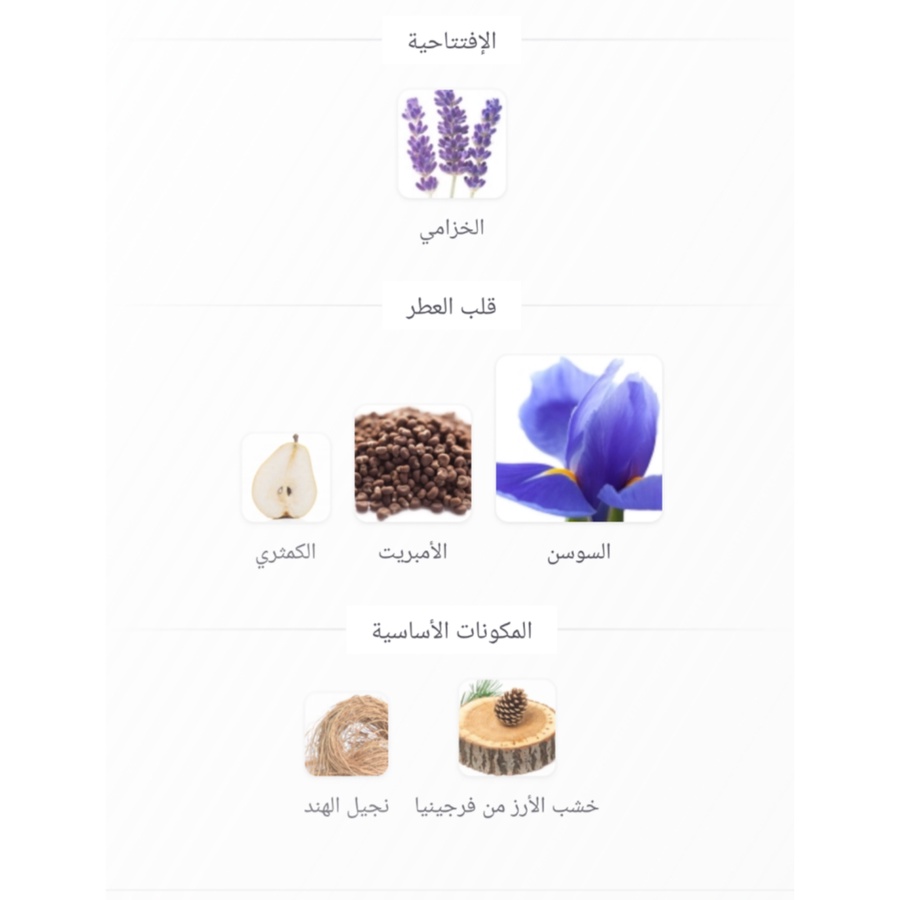 الرائحة والتركيبة: يتميز العطر بتركيبة فريدة، تبدأ برائحة اللافندر المنعشة، ثم قلب غني بـ زهرة السوسن الفاخرة مع بذور الأمبريت (المسك). تنتهي القاعدة بروائح خشبية دافئة من خشب الأرز ونجيل الهند، مما يمنحه لمسة عنبرية جذابة
